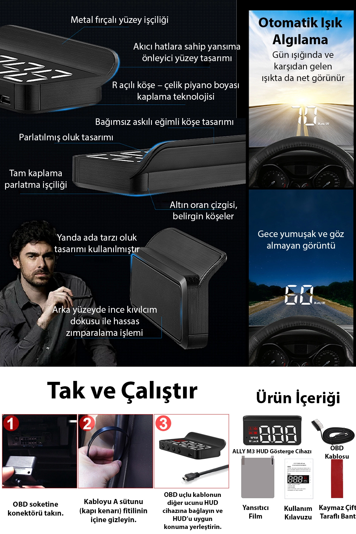 Araç kullanım güvenliğini artırmak, dikkat dağınıklığını azaltmak ve en önemli bilgileri göz hizasında görmek için tasarlanan ALLY M3 HUD, modern araçlar için ideal bir göstergedir.