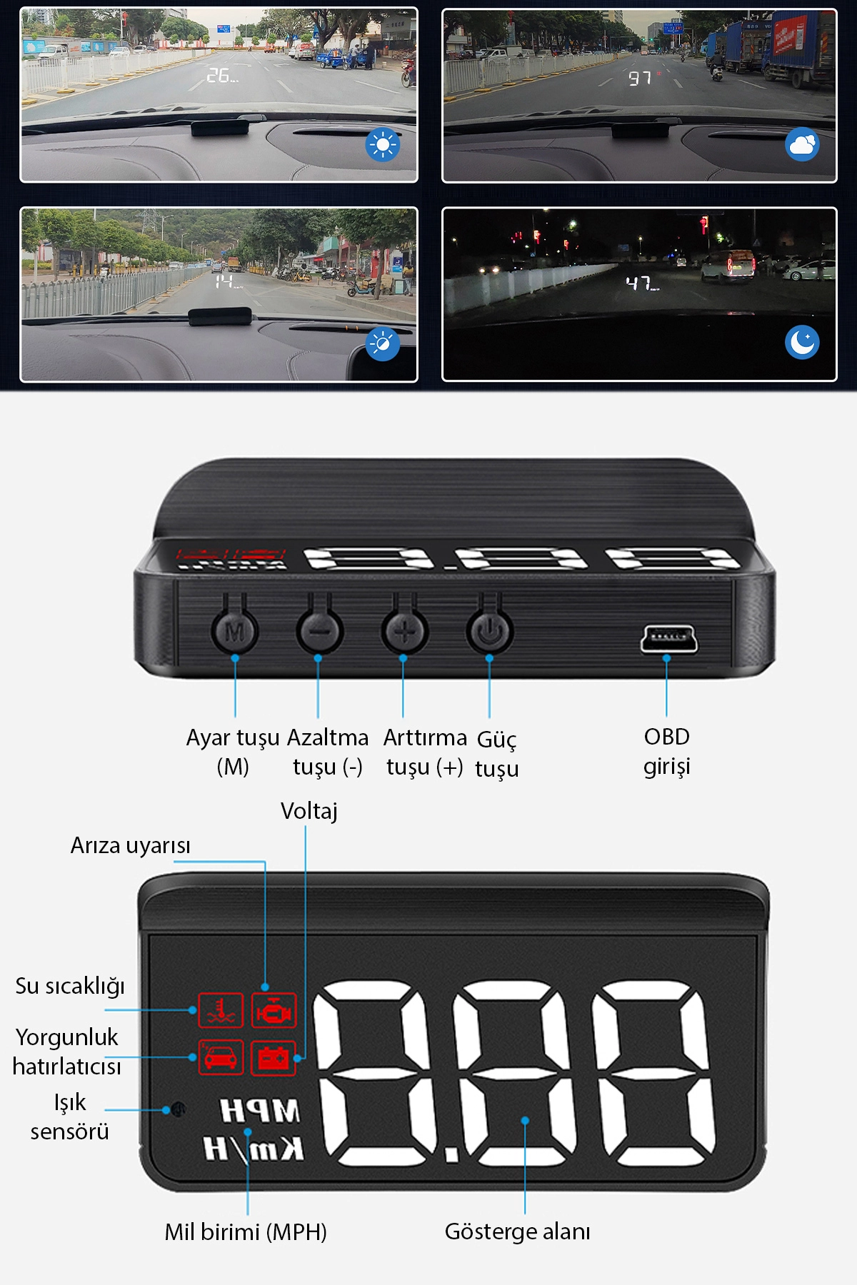 HUD üzerindeki ışık sensörü, ortam koşullarına göre ekran parlaklığını otomatik ayarlar.